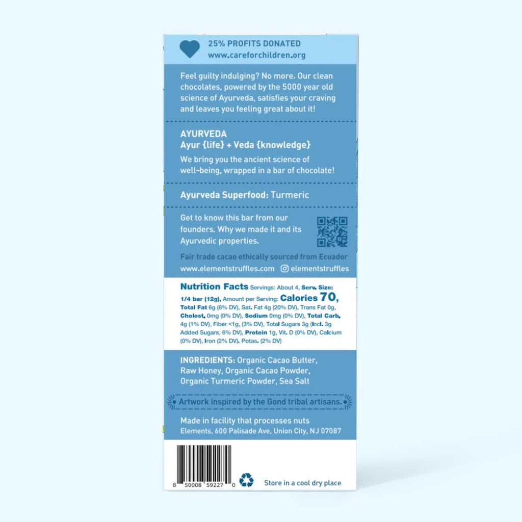 Of course, like everything else from Elements, Sea Salt bar is free from dairy, refined sugar, soy, lecithin, sugar alcohols, natural flavors, gluten or absolutely anything artificial. Think of it as a treat made from three two ingredients: Organic Cacao and Raw Honey. A pinch of Turmeric is added for the functional benefit. Sea la vie!