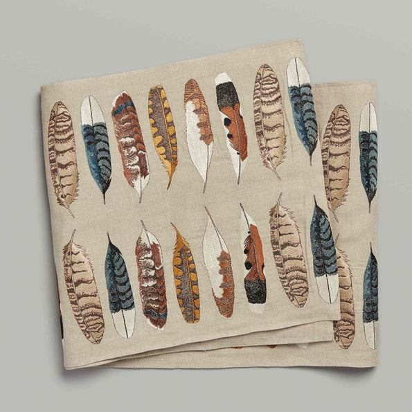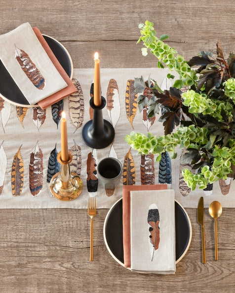 A collection of found feathers cascades down the Feather Harmony table runner. Discover the bold patterns and bright plumage of red tail hawks, golden flickers, kestrels, owls and blue jays. Each quill serves as a reminder to cherish and respect the incredible creatures of flight, sky, and air. For a full feather table setting pair with the corresponding feather dinner napkins.